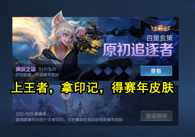 众所周知,每个赛季打上王者,在赛季结束的时候都会得到一枚王者印记,只要集齐四个印记,就可以在赛季年结束的时候,白嫖一款优质的赛年皮肤,赛年皮肤有多好?可以参照一下上年的赛年皮肤,原初追逐者有多好,赛年皮肤就有多好。而且今年的赛年皮肤很大概率给到热门的英雄李白,错过实在太可惜了,所以有希望打上王者的小伙伴,加把劲吧。