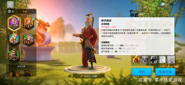 玩法思路就是优先将孙武升级到10级晋级2星,从而解锁用兵之道技能,然后随机升级一二技能直至一二技能皆升满,再解锁后续技能,至于天赋我们就根据需求升级驻防天赋就可以了。