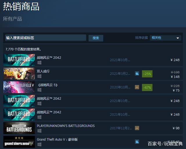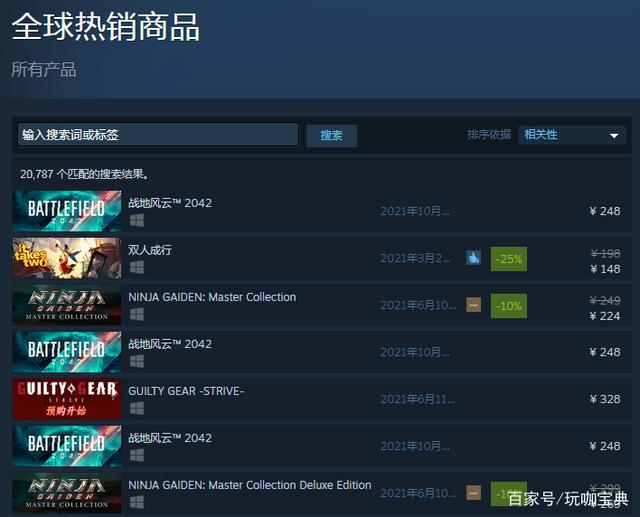 提醒:可能是Steam商店的bug,热销显示的《战地2042》三个版本都是同样的价格,暂时不清楚《战地2042》哪个版本登顶(虽然九成可能是标准版,但万一见了鬼呢)