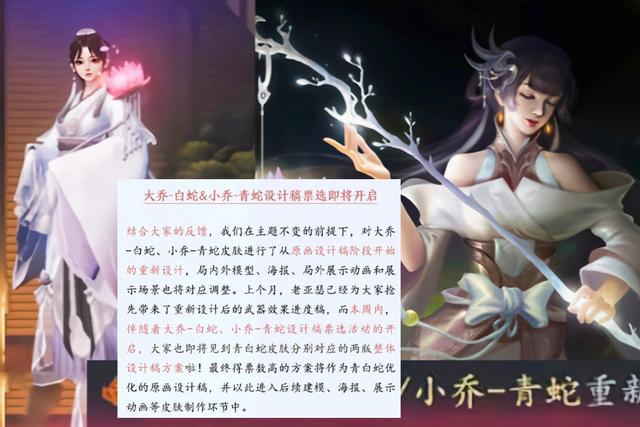 在今天的时候官方公布了皮肤优化的进程,大乔和小乔的白蛇和青蛇这两款皮肤,将会在本周公布重做之后的海报方案。在官方公布两种方案后,将会由玩家投票表决,票数最高的就会被定为新皮肤的海报,并且这一次这两款皮肤重做,皮肤海报局内动作以及英雄模型全部打翻重来,那么即将会迎来两款变相的新皮肤,应该还是非常漂亮的。