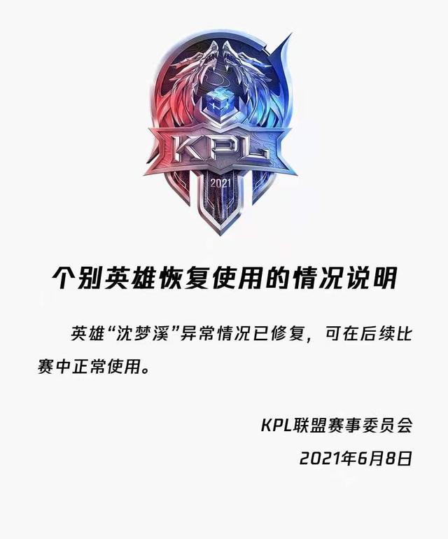 在经过快速调整修复之后,沈梦溪的这一bug终于解决了,KPL联盟在第二轮比赛开始之前,向各队伍做出了公告,恢复了热门英雄沈梦溪的使用。