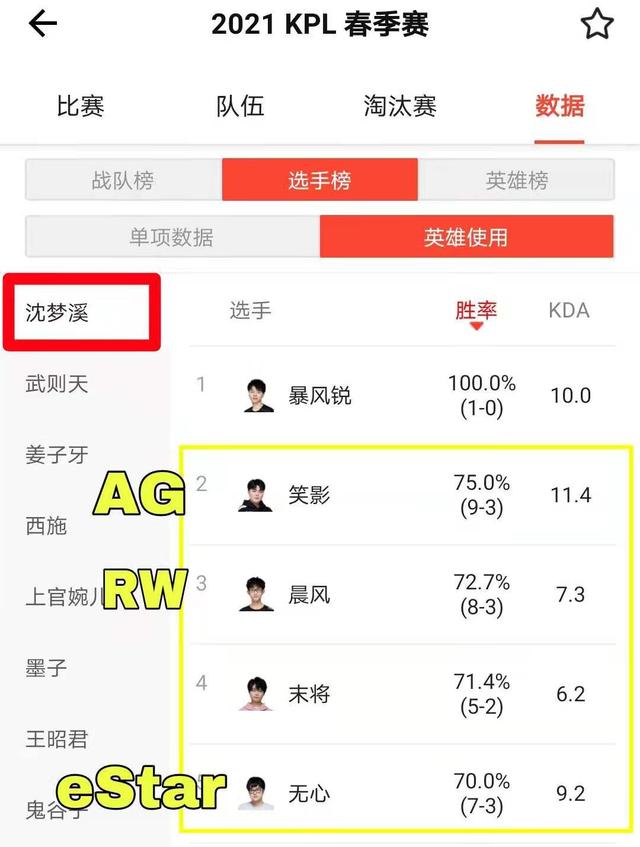 正是这个原因,KPL联盟不得不将沈梦溪禁用了,短期内确实没这个能力修复掉。不过这一改变,必然会造成相对的不公平了,一些队伍对于沈梦溪是情有独钟的,胜率和出场率都非常高,比如说AG超玩会,在常规赛使用沈梦溪12场,获胜了9场次,胜率达到了75%;又比如RW和eStarPro,也都使用沈梦溪达到了两位数,胜率都不低于70%。