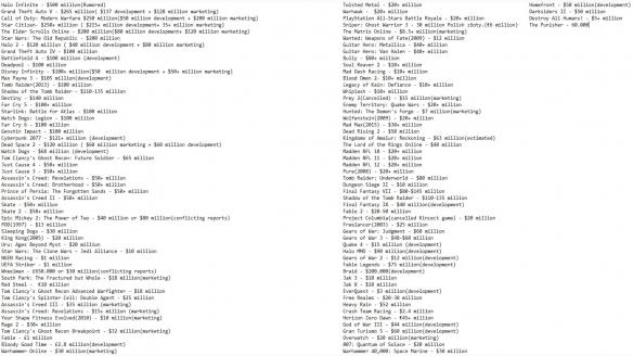 推主Timur222分享了一张游戏清单,上面统计了当今部分已发售和未发售游戏的投入(游戏开发+宣传费用)。这里面最烧钱的是微软的《光环:无限》。据传言,一度达到了5亿美元。
