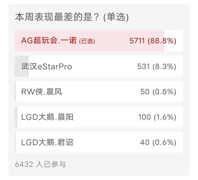 HP官方最近放出KPL黑榜投票结果,参与人数有6432人,其中有5711人投AG超玩会一诺为本周最差选手,很明显一诺这周的表现在玩家眼里完全不合格。HP官方投票时用一句话来概括一诺的上榜理由:今年的“状态”来得这么早吗?这句话很明显是反话,HP官方觉得一诺状态起伏太大,这次只是来得更早而已。