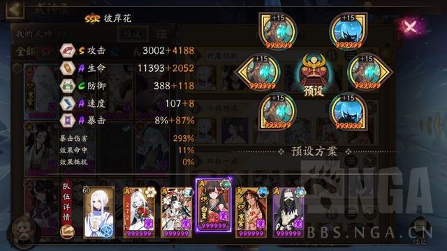 这边说下为什么用镇墓兽的花,其实之前用的是伤魂鸟的花,可能是由于面板和阿修罗实际减员能力并没有想象的那般优秀所以就使用了镇墓兽,反而发现因为毒瘤阵容的伤魂鸟SP花是常客,她的伤害往往不足以直接秒掉我们行动过后的彼岸花,会让彼岸花的血量压的较低,这个时候的彼岸花伤害相当可观,甚至对面晴明行动时花都能造成1W8左右的伤害,这个伤害杀掉常规的输出SP花绝对是绰绰有余。