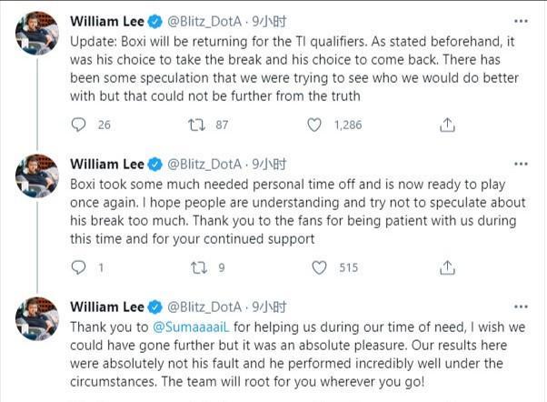 Liquid教练Blitz:感谢Sumail在需要的时候给予我们的帮助,我们此次Major的成绩绝对不是他的错,他在这种情况下表现得非常好。无论Sumail去哪里,队伍都会为他加油。Boxi将回归参加Ti预选赛,有些猜测说我们试图看看和谁会做的更好,但这并不是事实情况。Boxi因为个人原因紧急休息了一段时间,希望大家能够理解并且尽量不要过多猜测他休息的原因。感谢粉丝们这段时间对我们的耐心和一直以来的支持!