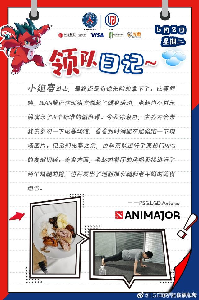 LGD以头名成绩强势晋级胜者组,一时风光无二。领队也放出了最近的领队日记,可是小明鞭做俯卧撑?我们想看赵公子的。