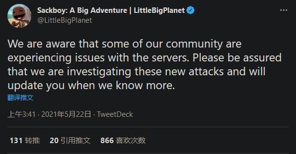 索尼旗下游戏《小小大星球》自三月起就有用户反馈无法连接服务器访问社区游戏内容,官方于3月12日开发商XDEV发表推特称,服务器将暂时下线以调查一些技术问题。