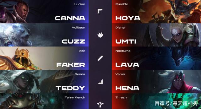 对局开启,进入BP界面,T1队长兼主力中单Faker选出招牌英雄沙漠皇帝迎战Lava梦魇,核心上单Canna拿到卢锡安配合Cuzz狗熊,等待他们的是兰博+皎月,老将Teddy祭出赛娜与Keria塔姆走下,BRO用维鲁斯+锤石组合应对。