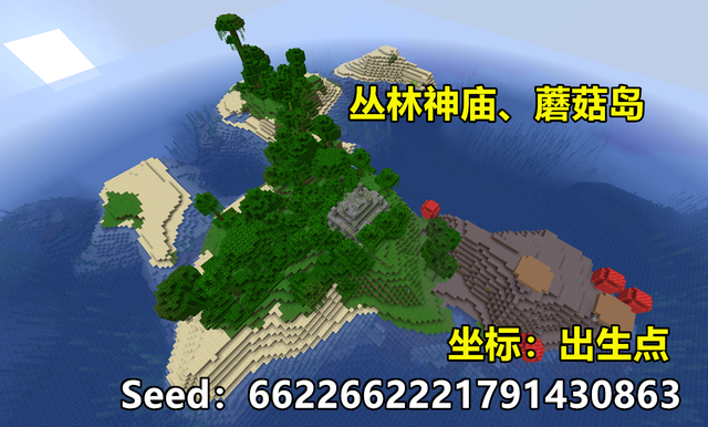 丛林中有一座丛林神庙,而蘑菇岛则十分的小,小到什么程度呢?我逛了一圈没发现一只哞菇,大家从图片上也可以看到没有哞菇的影子。当然,这只是暂时的,哞菇可以在蘑菇岛上生成,所以大家不用担心没有哞菇,只需要耐心等待即可。