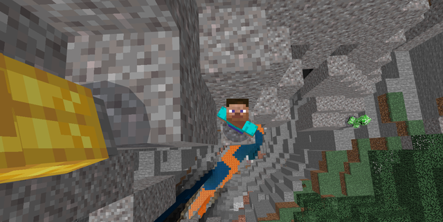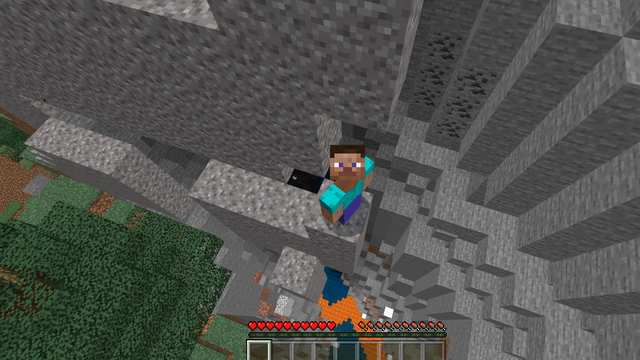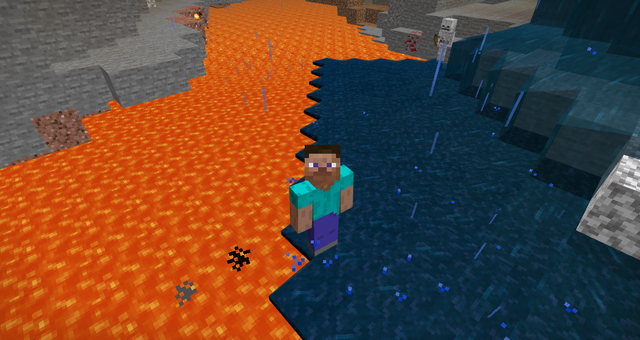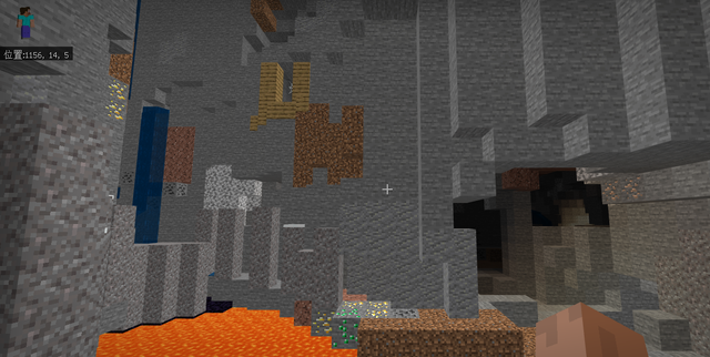 经过N次快进之后,方块菌重生在了一个相对来说比较正常的地方,虽然左边是水流,右边的岩浆河只有一步之遥。