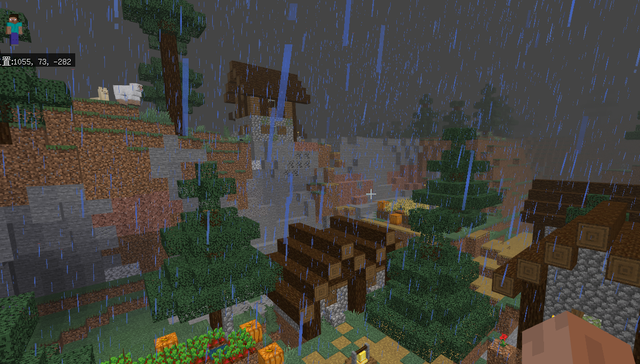 利用了一下神秘力量,方块菌发现在(531,69,1009)附近还有一个僵尸村庄,它的地理位置也比较特殊,位于悬崖峭壁之上。