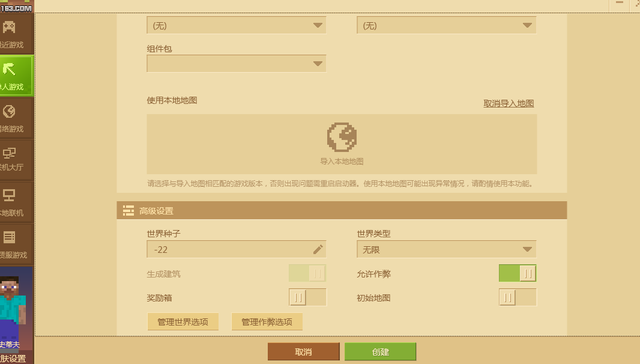 首先,咱们新建一个世界,选择基岩版,并且在世界种子处输入:-22