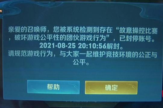 然而,纵使这位朋友游戏技术再高,也会有让他感到憋屈的时候,就在上个月27日,也就是他上国服前十那会儿,突然被游戏系统告知存在“故意操控比赛”的行为,也就是王者玩家们所说的“演员”。