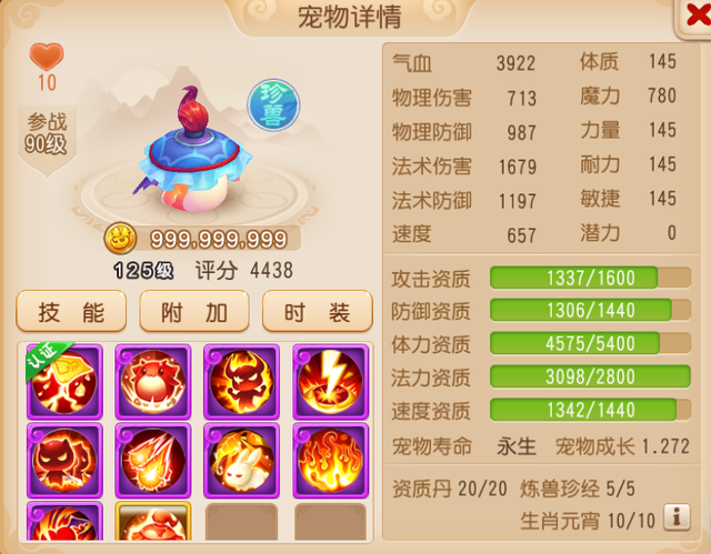 认证9技能上古灵符全红法宠,打书方面走的是服战中常用的单群法套路,颇为完美。