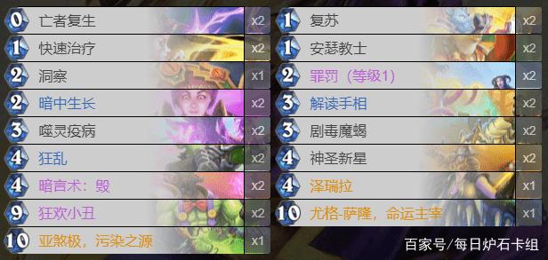 这套卡组的原型是奶牧,携带了大量的回血牌。复苏和快速治疗能保证牧师在快攻职业狂风骤雨一般的攻势中稳住血线,等到四费之后打出神圣新星清场。相比于平常的牧师,去掉了惩击、倦怠、除奇这些亏卡或者不稳定的解牌。只留下了AOE和治疗牌,就是为了能将解场的收益打到最高。前期也不着急交AOE,可以让自己的血量保持在20左右,泽瑞拉加上复苏的组合足以扭转任何劣势对局。