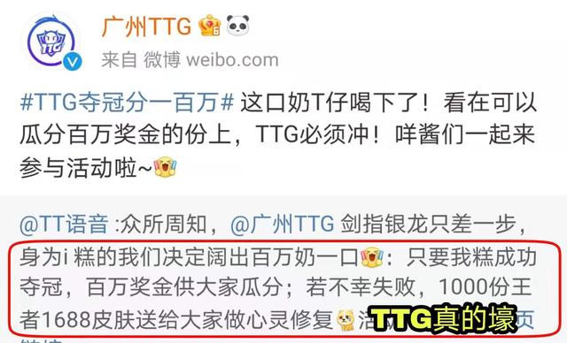 除了压力小之外,TTG战队又给粉丝们爆料了一个好消息,如果他们的队伍可以拿到最后的总冠军,赞助商TT语音就会给粉丝们瓜分100万,用来庆祝队伍夺冠。看到了官博的发文之后,粉丝们热议不断,这么“宠粉”的良心俱乐部,还真的少见啊,这奖金数量都快赶上一般队伍一个赛季所拿到的奖励了吧,而且是无偿分给粉丝们。