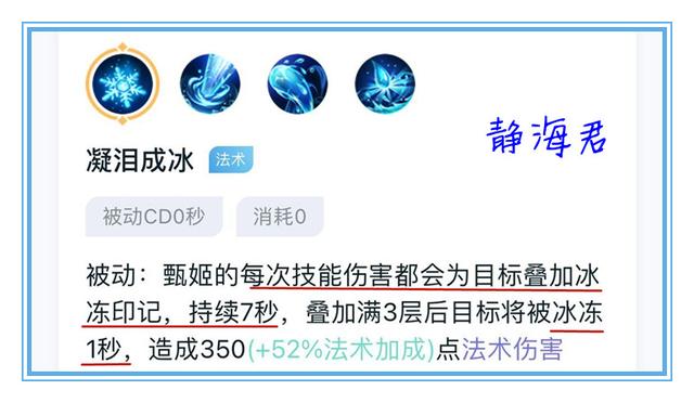 总结一下甄姬的技能结构:甄姬的一技能可以击飞,二技能可以超远距离弹射,三技能带有范围减速,满足被动技能要求后则可以将目标进行冰冻。