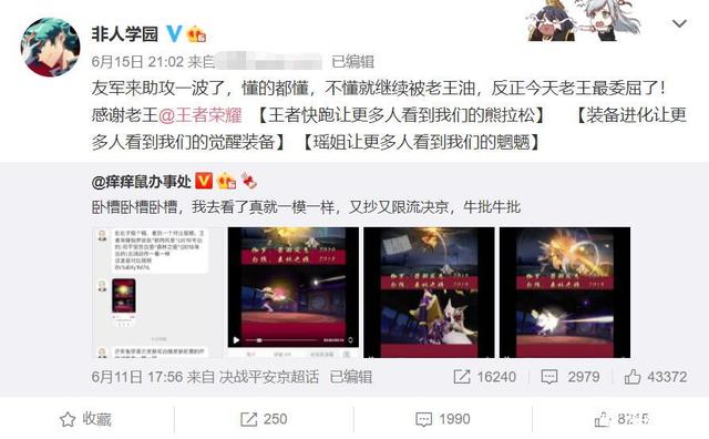 值得一提的是,正如《决战平安京》有《非人学院》助阵一样,腾讯这边,腾讯电竞官微也是亲自下场,为《王者荣耀》的回应做扩散。