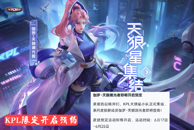 在昨天的时候,伽罗的KPL限定天狼溯光者,这款皮肤也是已经公布了技能特效,整体来看皮肤特效非常不错,而且也会在近期正式上线,在今天的时候,这款皮肤的预约活动已经开启,只需要60点券就可以提前体验到伽罗的这款新皮肤,因为按照官方的规定,提前预约可以提前得到皮肤体验卡,还可以享受最低6折的折扣,这款史诗级的限定皮肤,到最后只需要472点就可以拥有,还是非常划算的。