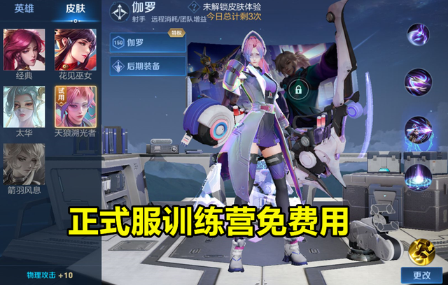 首先是天狼溯光者的预售,更新过版本的选手,可以不进行预售获得体验卡,再上手对比皮肤手感的繁琐步骤,而是直接进入训练营中开启限制体验(一天3次),皮肤性价比突出的关键一点在于,伽罗的平A不止自身有出彩的粒子特效表现,命中敌人后敌方身上也会附加一层拖尾,“挨打”就送特效的亮点还是挺有意思的。