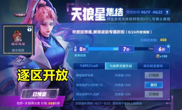 而该皮肤的预售活动,由于重启的时间比较晚,再加上是逐区开放的,区服比较靠后的选手还需要再等等,而本次预售活动的具体规则设计的很简单,只需要完成对局+拥有伽罗+预售皮肤,即可达到700的回馈值,开启个人专属6折福利,并且溯光者预售任务完成后,除了会赠送100荣耀积分,还会额外获得皮肤专属表情,入手性价比还是很高的。