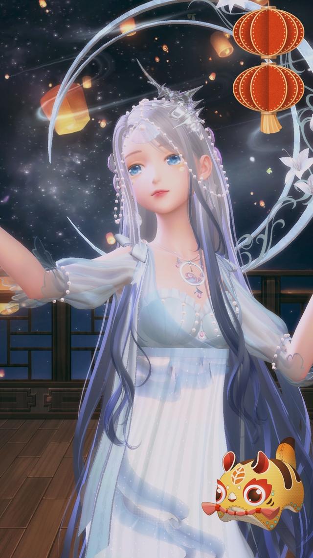 网友“@绿老头”的配搭很有韵味,整体风格柔美温柔,银色渐变长发和裙子配搭得很好,背景应该是与中秋喜庆节日有关,很好地呼应整套搭配的和谐性。