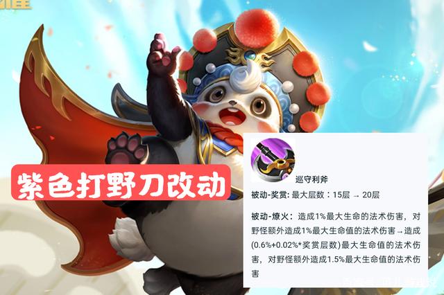 然后就是紫色打野刀的改动,这次改动将紫色打野刀固定百分比最大生命值加成的伤害改为了一半生命值加成,一般奖赏层数加成,这次改动对于打野位置来说是增强。