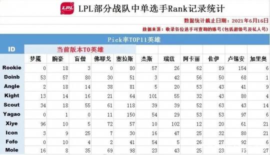 IG超话的粉丝近期统计了半年以来全联盟中单选手的Rank情况,并将夏季赛已经打过比赛的中单选手的Rank数据单独绘制成表格。由于是IG粉丝制作的,因此Rookie被排在第一位。只是从数据上看,他显然已经脱离版本了。