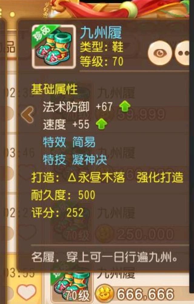 从装备截图来看,这是一双70级的“九州履”。初始属性方面:法术防御+67、速度+55,这部分不算是重点,毕竟后期还要熔炼,要说它的价值所在,肯定就是简易与特技了。如果只是刷刷日常任务,没有必要更新这种装备,但如果是为了比赛,双蓝就很关键了。如果说对“凝神决”不太满意,那么可以洗一洗,像是什么罗汉、晶清,只要次数足够多,肯定就能出现。如此给力的一双鞋子竟然只摆了66W,大老虎你这是自己坑自己的节奏啊。