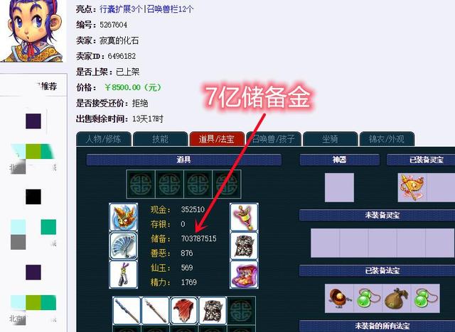 看到上面的这一个角色了吗?上面的这个角色目前卖的价格是8500块,他的角色上目前还带着七个亿的储备金,按照梦幻币来计算,七亿的梦幻币大约可以卖到5000左右,但是变成储备金的话,七亿的储备金卖的钱就比较少了,所以小编感觉上面的这个角色能不能购买要看该角色的底子,底子比较强或者身上带的其它的物品是可以购买的,如果仅仅只是一个没有底子只拥有着七亿储备金的角色,这样的角色买过来也是很累的,需要自己养成。