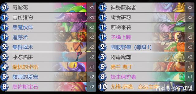 起手要留剧毒魔蝎,因为本身是随从,同时还能补足资源,前期过渡上会非常舒服~毒蛇花和击伤猎人是一套非常好用的组合,可以拿来补刀,也可以直接点掉对手的高质量随从。而且毒蛇花是0费,在子弹上膛的回合中能空出费用来打其他法术牌。顺手解掉对面的场面,这样就可以避免因为毒蛇花一张单解而浪费的卡位。