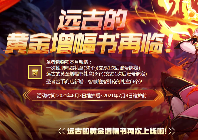 【总结】:13周年庆的欢乐代币券带来了奥兹玛开荒期间的1次增幅契机,对于想要快速提升名望的小号是1个优势,具体时间就是6.27代币券领到手的那几天,不过拍卖行是3本远古黄金书一起卖,想要增幅11~12的勇士提前准备好金币吧,尤其提前创建了“女鬼剑第五职业”的玩家。