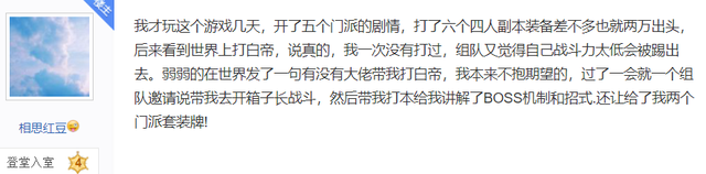 只要你在世界频道嚎一声:“小白刚玩儿这游戏"。一定会有一堆男玩家女玩家加你,亲切的问你“还需要师父吗?”