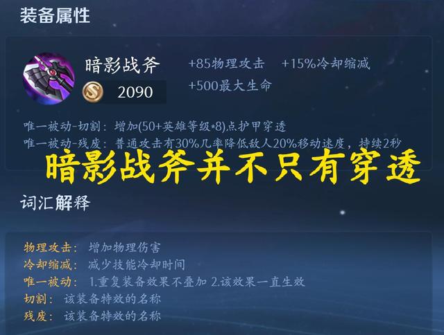 暗影战斧增加的并不仅仅只是穿透效果,而玩家看重暗影战斧的也并不仅仅只是穿透效果,还有它的500血+15%冷却缩减,500血算是半价肉装了,而15%冷却则相当于一双冷静之靴,2个基础属性的附加使得暗影战斧这件装备大大升华,例如韩信前期出暗影战斧可以减少技能CD,提升一定的坦度,不至于看起来那么脆。