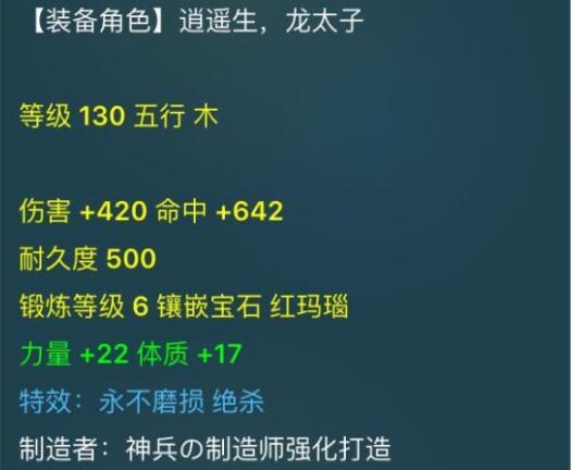 等级越高的装备用珍珠补充耐久度的时候成本就越高,所以对于高等级物理系的玩家来说,他们使用的武器最好要拥有永不磨损特效,上面的这把武器对159级物理系的玩家来说真的就非常的好,上面这两个蓝字的叠加可以说是完美,因为上面的这两个的全部都是在任务中生效的,永不磨损可以让这把武器不想耗耐久度,而绝杀开始让玩家进行物理输出是有可能直接秒杀怪物。