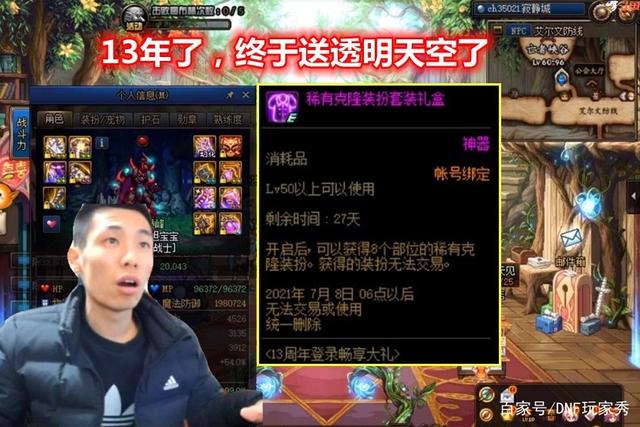 13周年庆奖励全曝光,旭旭宝宝逐条解析,非常惊叹,“13年了,策划终于送透明天空套了”!亲爱的勇士,如果你脱坑已久,这是一个回归的绝佳时机,不仅有透明天空,还有神话、史诗装备,各种细节打造,秀儿宣布,这是最好的一次周年庆!