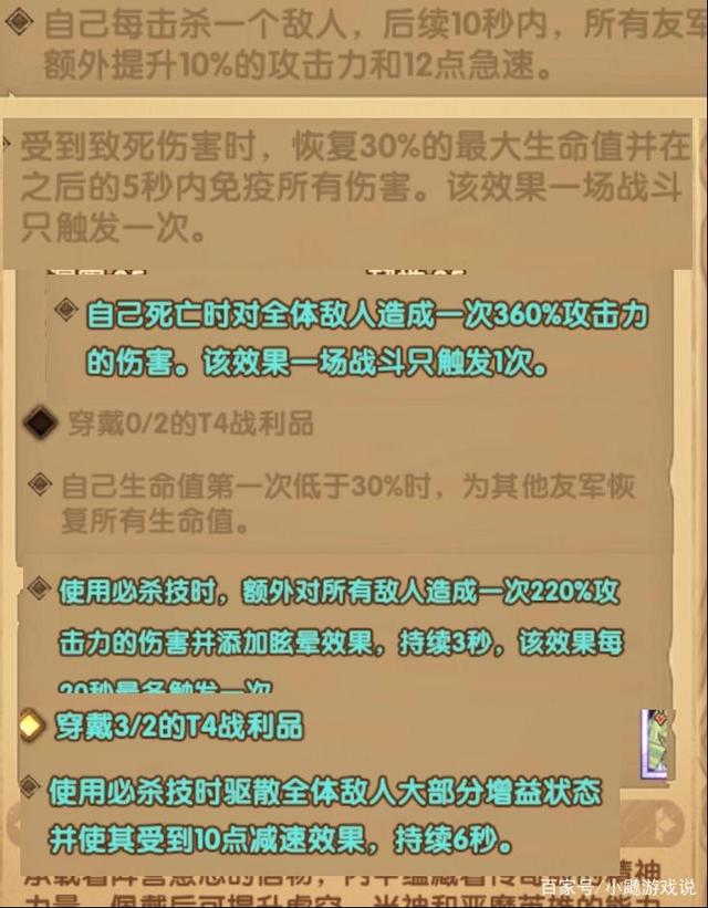 自己生命值第一次低于30%时,为其他友军恢复所有生命值。当前场上任意敌我双方的非召唤物英雄被击杀时,自己活动该死亡英雄3%的攻击力,并恢复自己15%最大生命值。使用必杀技时,额外对所有敌人造成一次220%攻击力的伤害并添加眩晕效果,持续3秒,该效果每20秒触发一次。自己死亡时对全体敌人造成一次360%攻击力的伤害。该效果一场战斗只触发一次。使用必杀技时驱散全体敌人大部分增益状态并使其受到10点减速效果,持续6秒。受到致死伤害时,恢复30%的最大生命值并在之后的5秒内免疫所有伤害。该效果一场战斗只触发一次。自己每击杀一次敌人,后续10秒内,所有友军额外提升10%的攻击力和12点急速。等等,还有其他的小飉没有遇到。这些传说圣物才开启的属性有输出的,辅助的,还有坦克的,可以看需求来选择。
