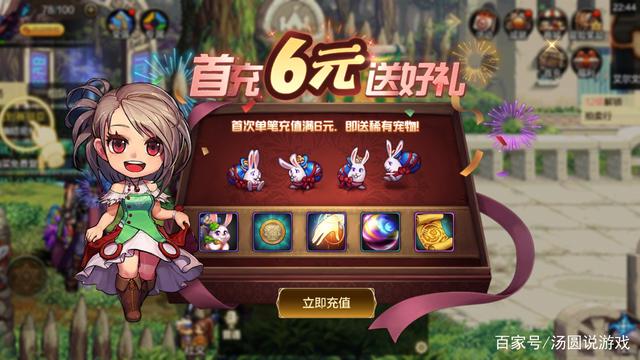 在游戏页面上和之前版本也是各不相同,这次的页面最抢眼的就是右上角出现的“首充”二字图标在闪闪发光。只需要六元一个萌萌哒的宠物小兔子带回家,咳咳,它是稀有宠物哦!当然,这个十分正常。