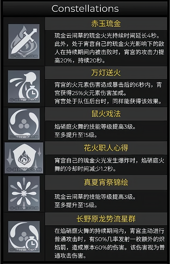 命之座改动在4命和6命上,4命爆炸后冷却时间相比之间多减少0.2S,六命宵宫在焰硝庭火舞持续期间进行普通攻击时额外发射一枚赤焰箭的概率由之前的40%提升到50%,同时造成的伤害也在原基础上提升了10%,这样的改动氪金大佬们自然是乐意见到的。对于强度党来说,低命的宵宫当主C效果可能一般,但作为副c的能力还是非常强大的,可以根据自己的需求选择是否抽取。屯屯鼠们如果有火C需求也是可以抽取的,毕竟后续版本火C复刻还需要等一段时间。