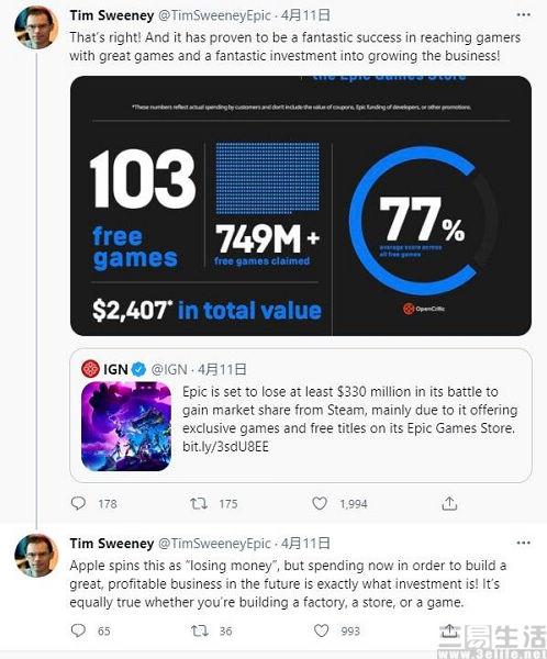 但Epic games方面还是表现得相当乐观,并积极转发有关Epic游戏商城大额亏损的报道。Epic games的CEO Tim Sweeney也表示,“目前所做的一切是对未来的一种投资方式,这能让我们为之打造一个更优秀的、可以获得巨大盈利的游戏平台。”