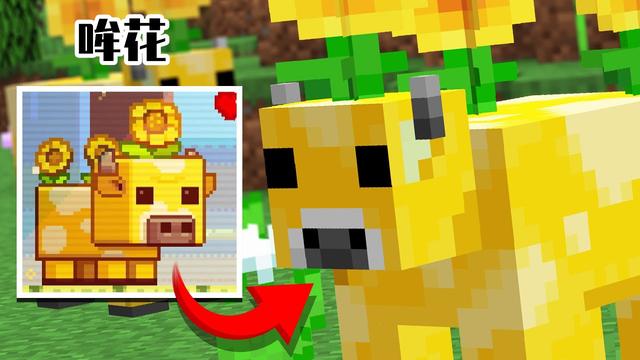6、哞花(Moobloom),2020年Minecraft Live直播投票的新生物,来自即将关服的《我的世界:地球》中的生物。它和哞菇一样属于变异牛,没有什么攻击力。总是漫无目的地到处走着,但是它所经过的地方都会诞生花。80%的几率是蒲公英,20%的几率是向日葵。(ps:好浪漫的一头牛啊~ 突然觉得,发光鱿鱼是最不香的那一个了。)