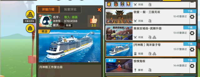 初次进入这张地图,我的目光便被游戏中十分震撼且庞大的游轮所震撼住了,不夸张地说,这绝对是我在《迷你世界》中所见到过最为庞大的建筑物。当然,最令我感到震撼的除了这艘游轮之外,还有游轮之上十分完善的各类生活基础设施。
