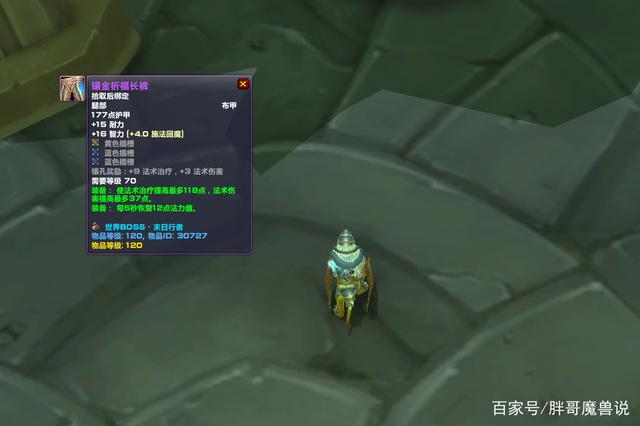 镶金祈福长裤同样掉落于末日行者,并且同样是布甲,不过这件装备是治疗的装备。大量的治疗量加成,还有5秒12点的回蓝效果,并且附带三个宝石孔,如果说缺点的话,唯一缺点就是不加精神。