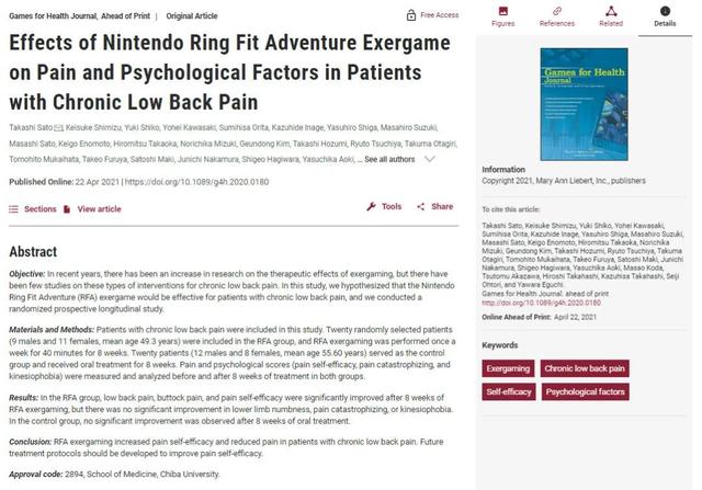 根据日本千叶大学医学部最新发布的一项研究,平均年龄在 49.3 岁的慢性腰痛患者,在经过每周一次、每次40分钟、一共8周的健身环锻炼后,腰臀部的疼痛感相较于吃止痛药的对照组有明显缓解。
