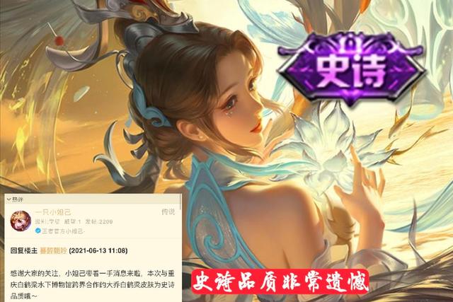 这些新皮肤的上线让玩家非常满意,而大乔的一款白鹤梁联动皮肤的公布,才是一个重点,根据王者荣耀官方的介绍,在7月份大乔将会和白鹤梁水下博物馆联合推出一款神女皮肤,而且官方已经公布了这款皮肤的宣传海报,看起来非常的漂亮,根据官方的介绍,这款皮肤的品质仅仅只有史诗,但是在官方公布皮肤品质之后,却有很多的玩家哭喊着想要一款传说皮肤,因为看到漂亮的宣传海报之后,不上线一款传说就对不起这样的设计,这在王者荣耀中绝对是非常少见的。