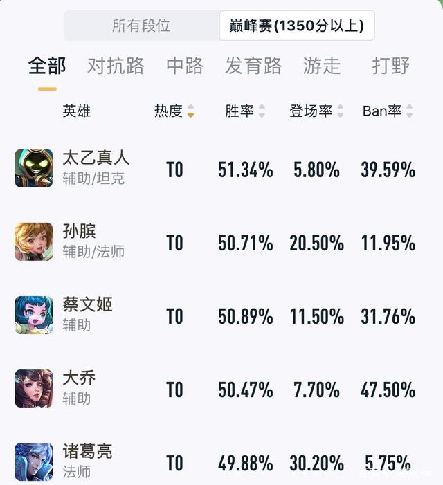 到这个月16号为止,王者荣耀巅峰赛1350分以上热度最高的五位英雄分别是太乙真人、孙膑、蔡文姬、大乔和诸葛亮,从这个热度榜我们可以分析出来辅助在巅峰赛中有举足轻重的地位。虽然很多玩家都看不起软辅,但是无论是软辅还是硬辅都会有他自己的优势和劣势,只要学会扬长避短,就能打出不错的效果。而且大乔、蔡文姬、孙膑都是软辅,至于太乙真人有人觉得他夹在硬辅和软辅中间,有软辅的特性也有硬辅的特性,不好区分,但是诸葛亮就很好判断了,他是一个很出色的法师,甚至于有玩家觉得他是这个赛季巅峰赛的最强法师。