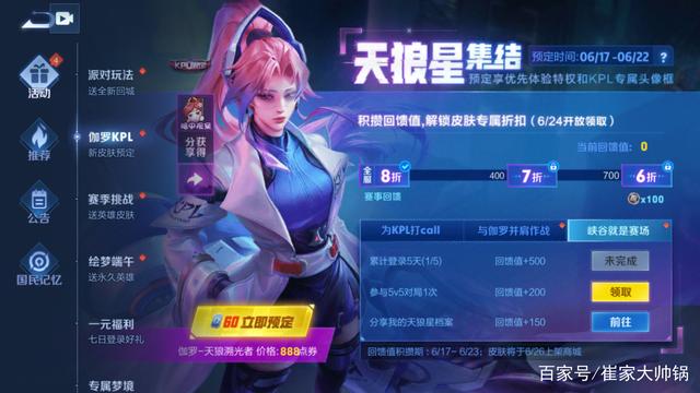 17号官方正式开启了伽罗天狼溯光着系列KPL限定皮肤预售活动,预售价格60点卷就可以持续体验7天同时有折扣优惠,总价888点卷如果按官方给的8折或者6折优惠来定其实挺划算的。