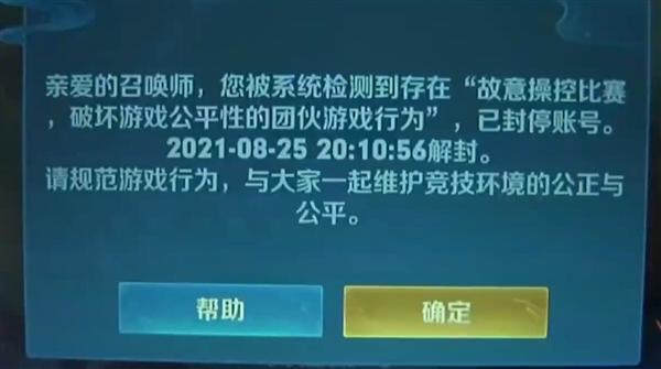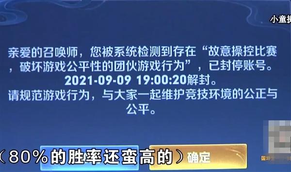 按照小童给出的截图,账号被封停的原因是系统检测到存在“故意操作比赛,破坏游戏公平性的团伙游戏行为”。
