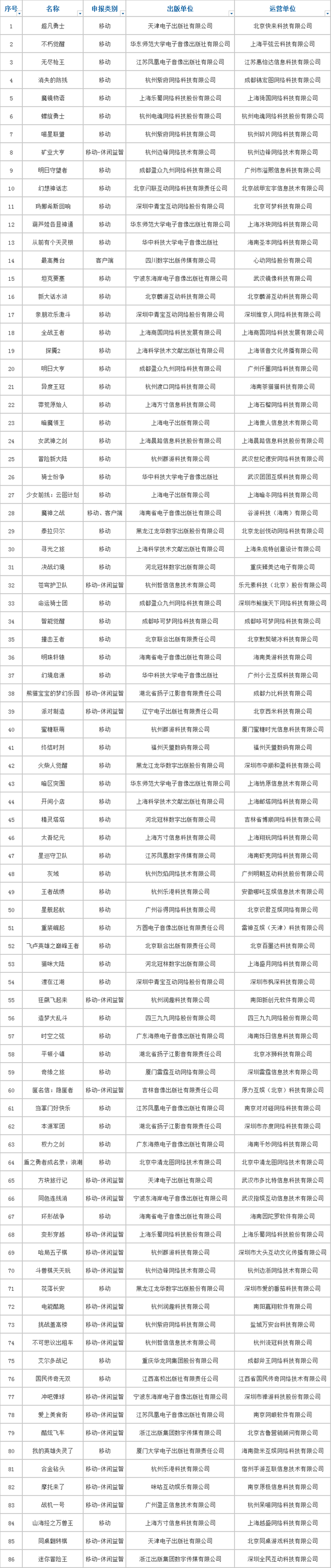 本次版号已经是连续第三批过审数量相同,共有86款游戏过审,其中移动游戏63款,移动-休闲益智22款,客户端游戏2款。(《魔神之战》同时取得了移动和客户端两个版号)。